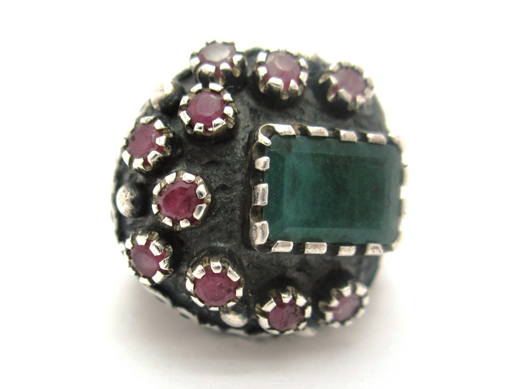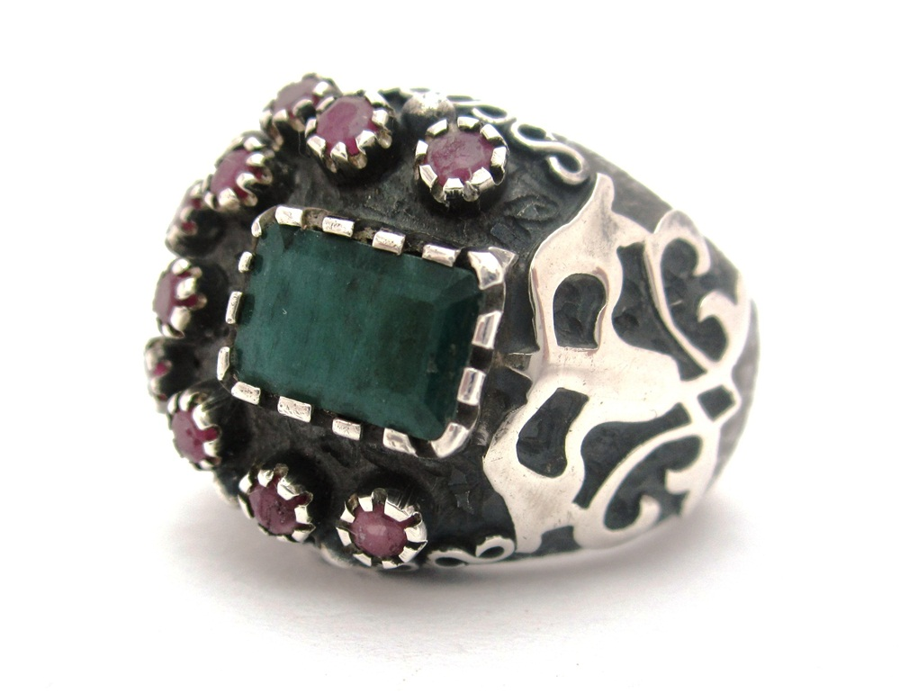 KOLEKSİYONLUK TEK ÜRÜNLER / Yakut Zümrüt Taşlı El İşçiliği Gümüş Bayan Yüzük